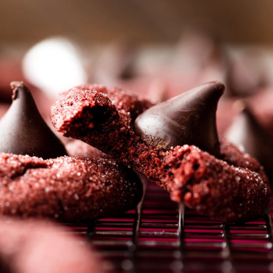 These red velvet kiss cookies are a colorful spin on traditional peanut butter blossoms. Inspired by the classic red velvet cake, they’re soft-baked and buttery with cocoa and vanilla flavors. While the cookies are still warm, press Hershey’s Kisses into the centers.